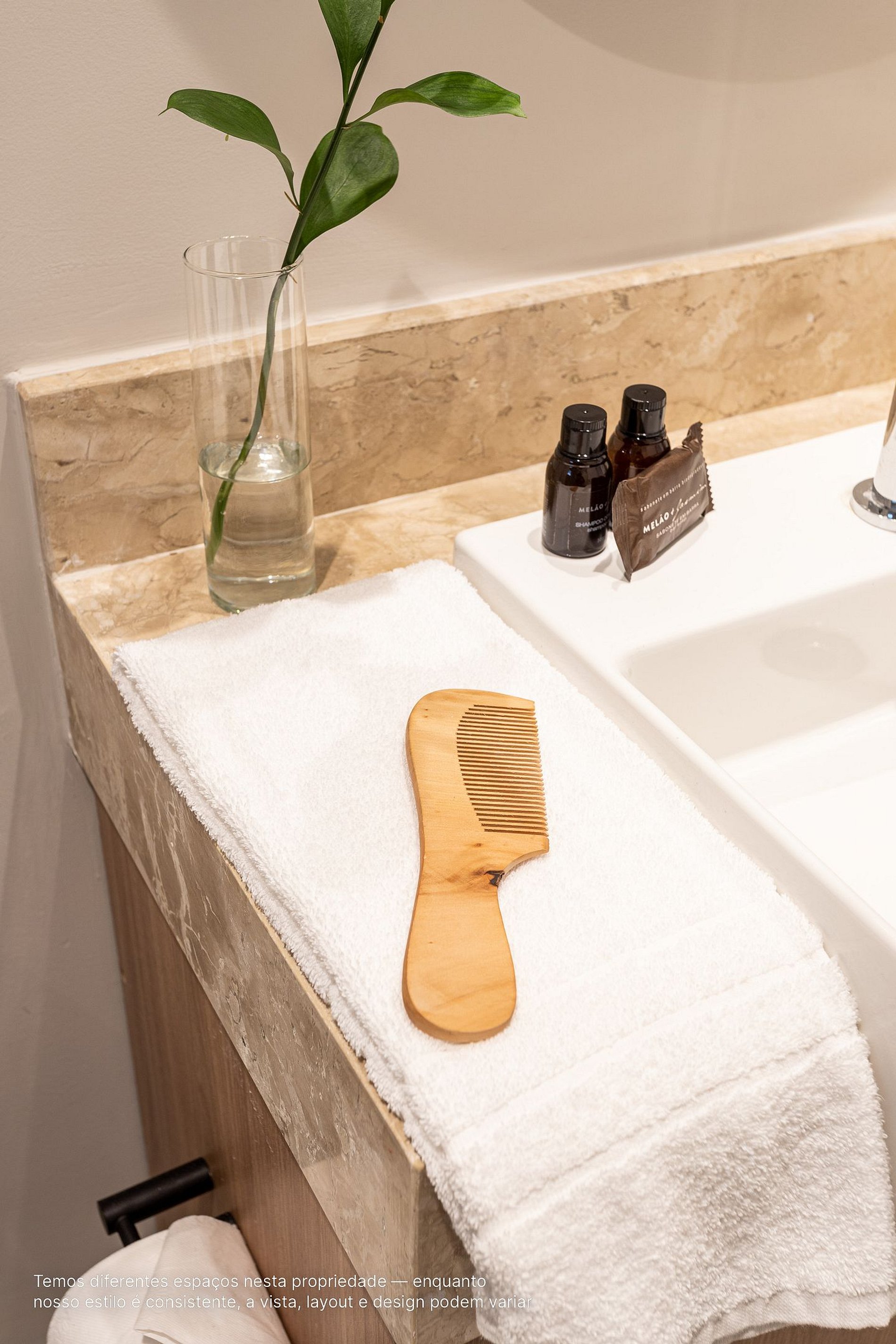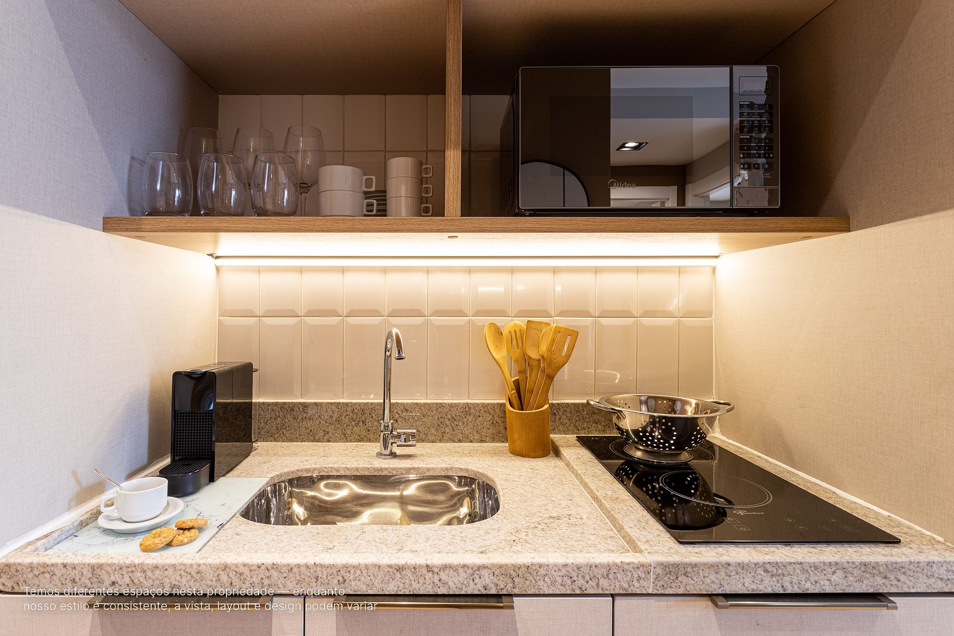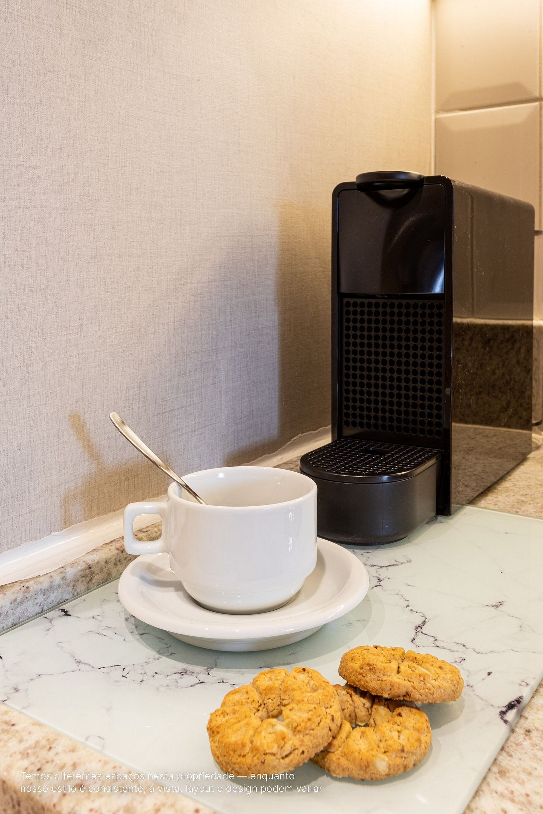 - A decoração e as amenidades dos apartamentos podem ter variações como cafeteira (pó ou cápsula), ferro de passar x steamer, fogão x cooktop (com ou sem forno).