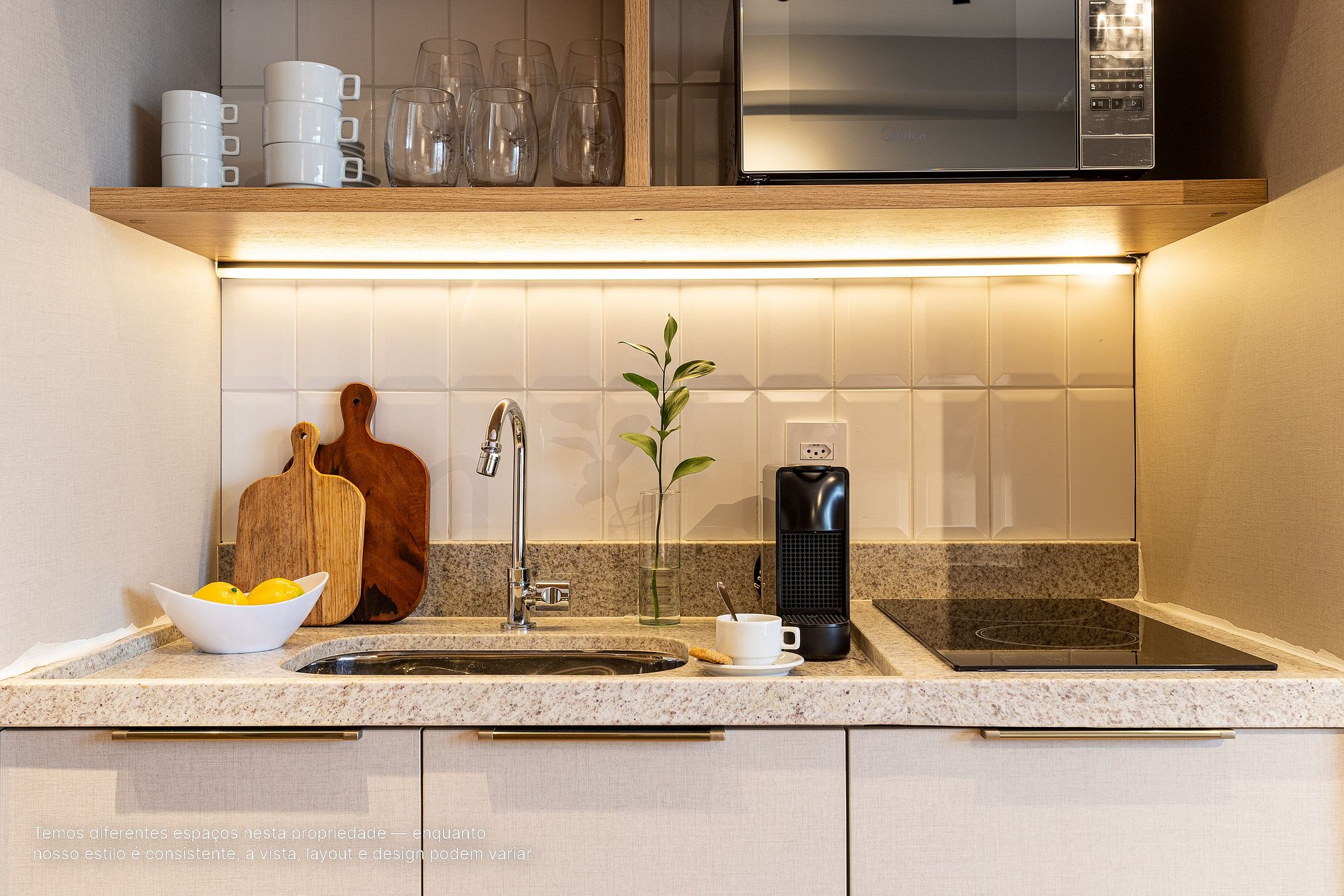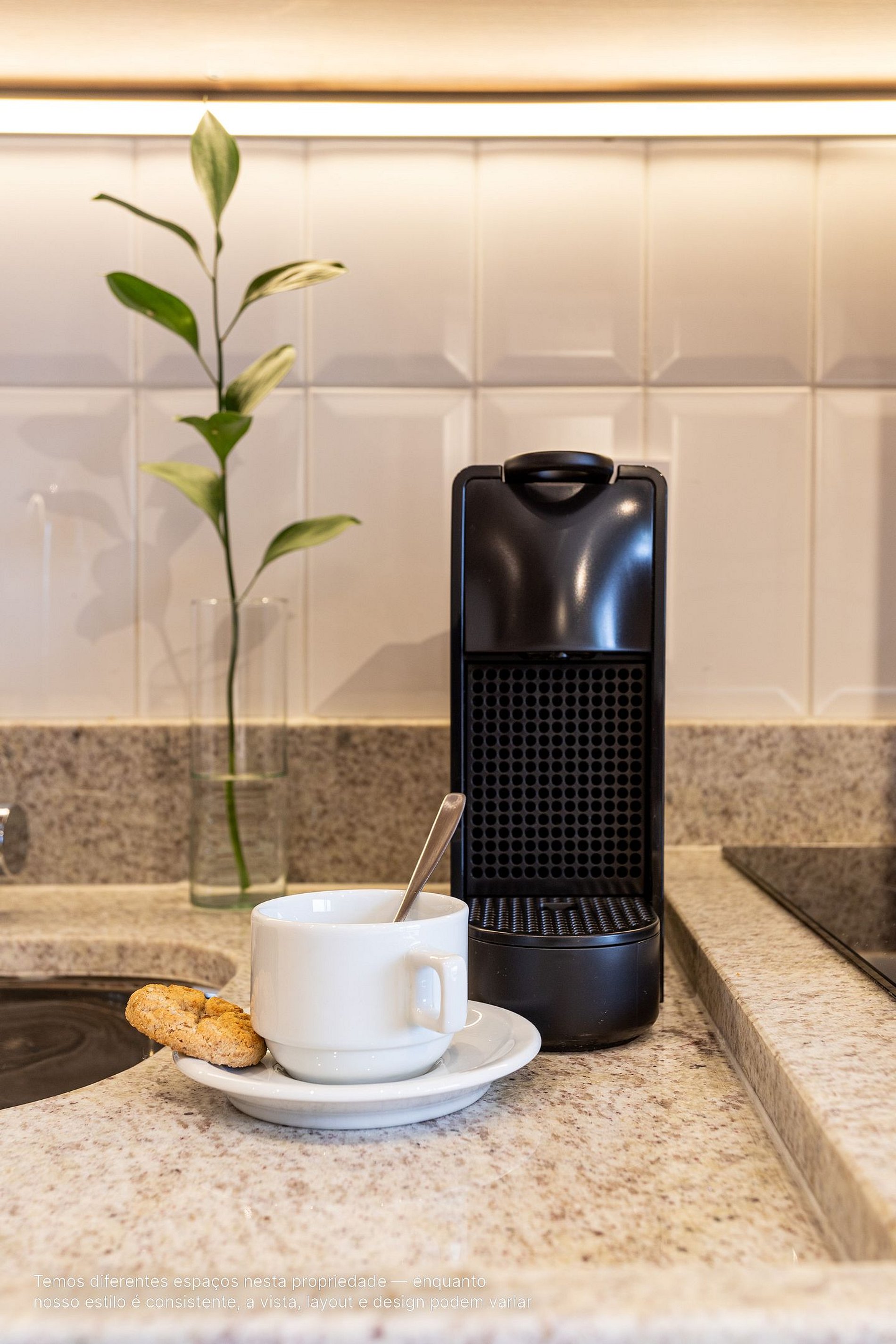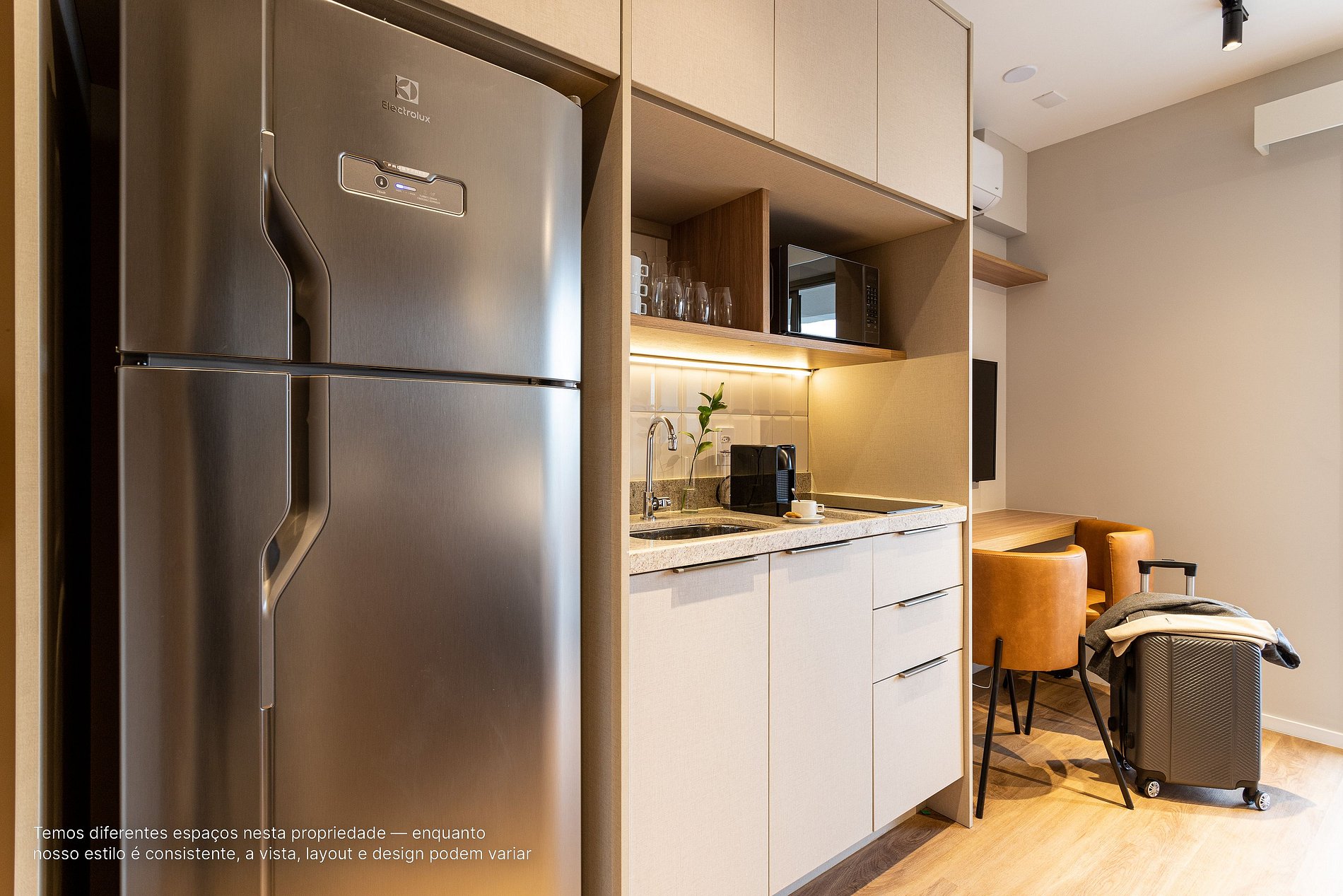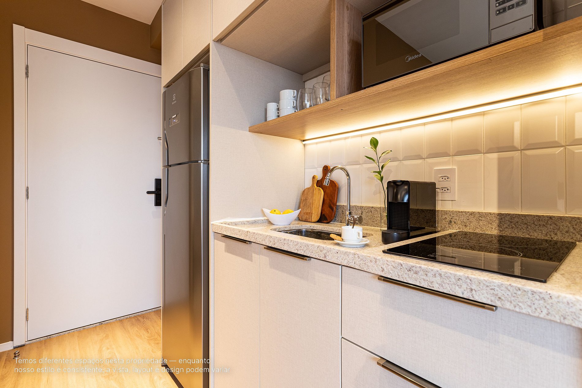 - A decoração e as amenidades dos apartamentos podem ter variações como cafeteira (pó ou cápsula), ferro de passar x steamer, fogão x cooktop (com ou sem forno).