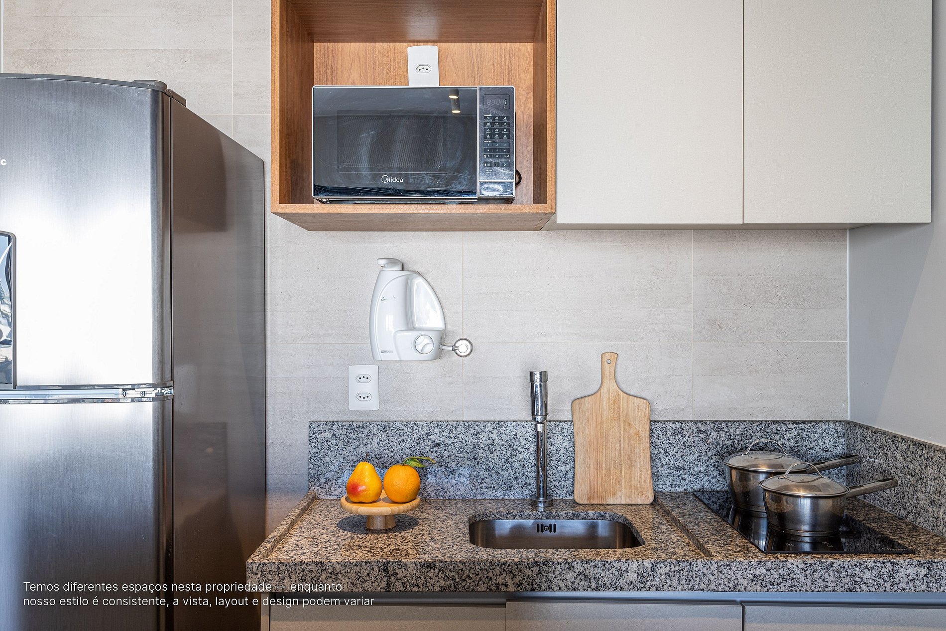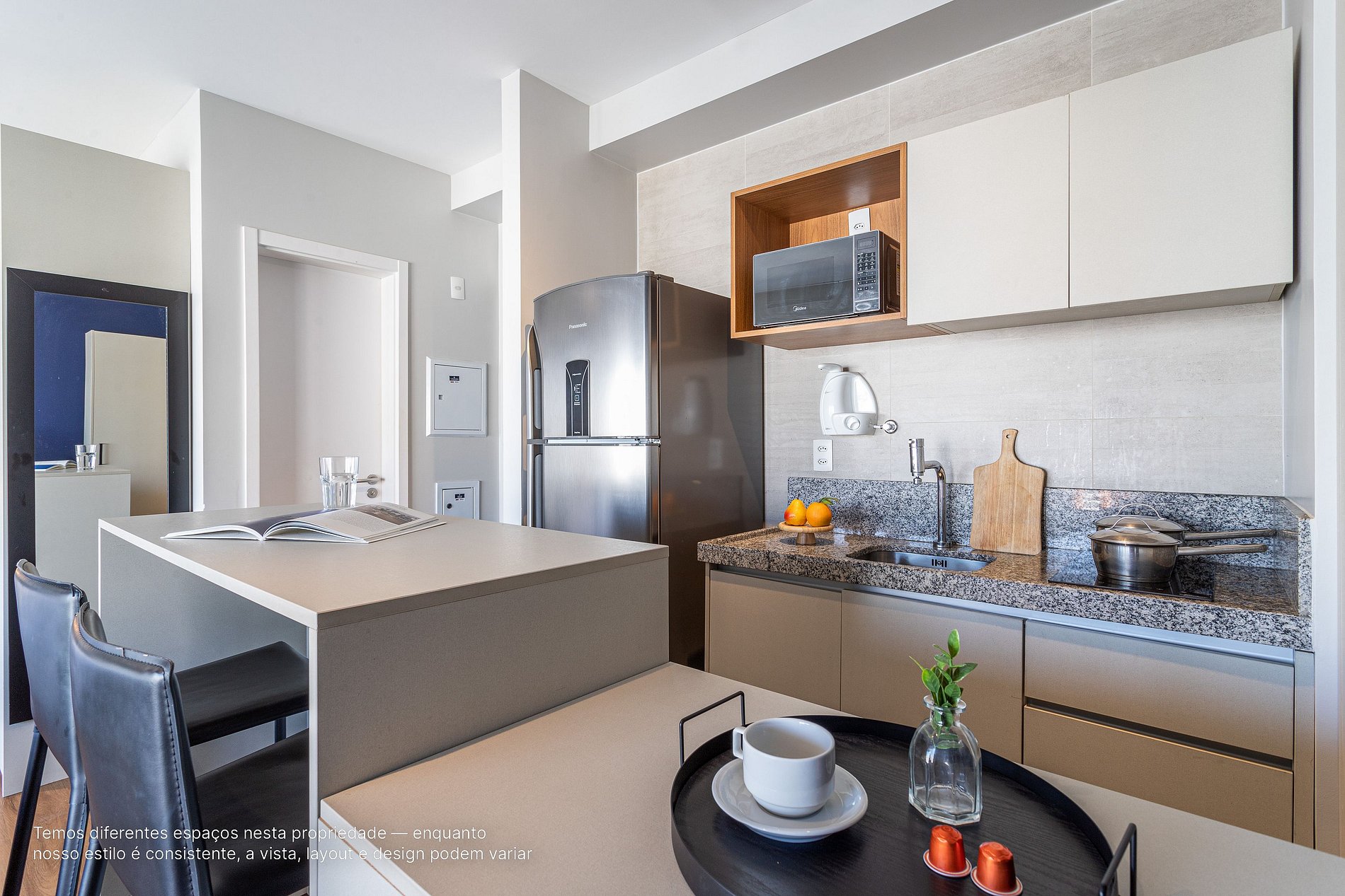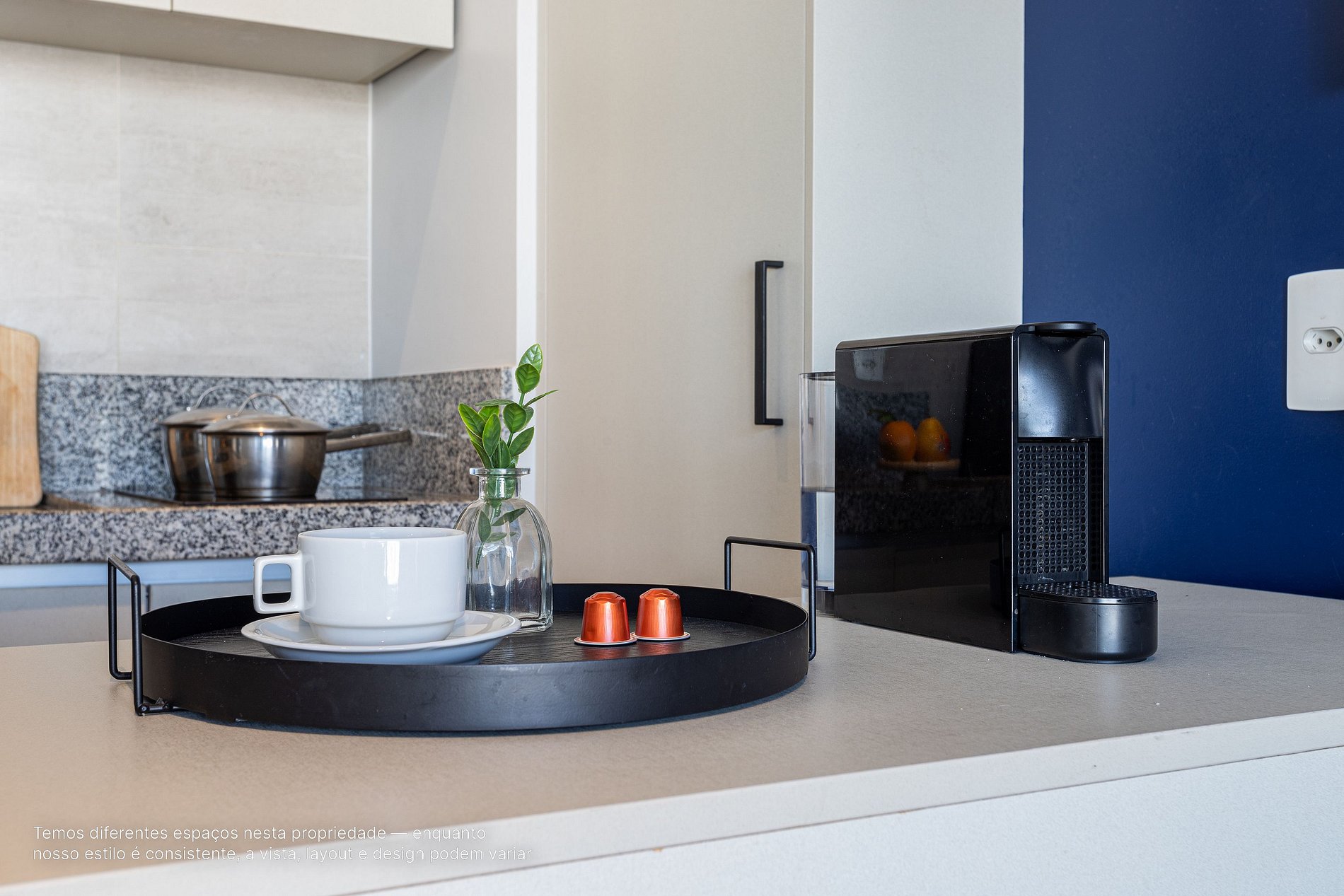 - A decoração e as amenidades dos apartamentos podem ter variações como cafeteira (pó ou cápsula), ferro de passar x steamer, fogão x cooktop (com ou sem forno).