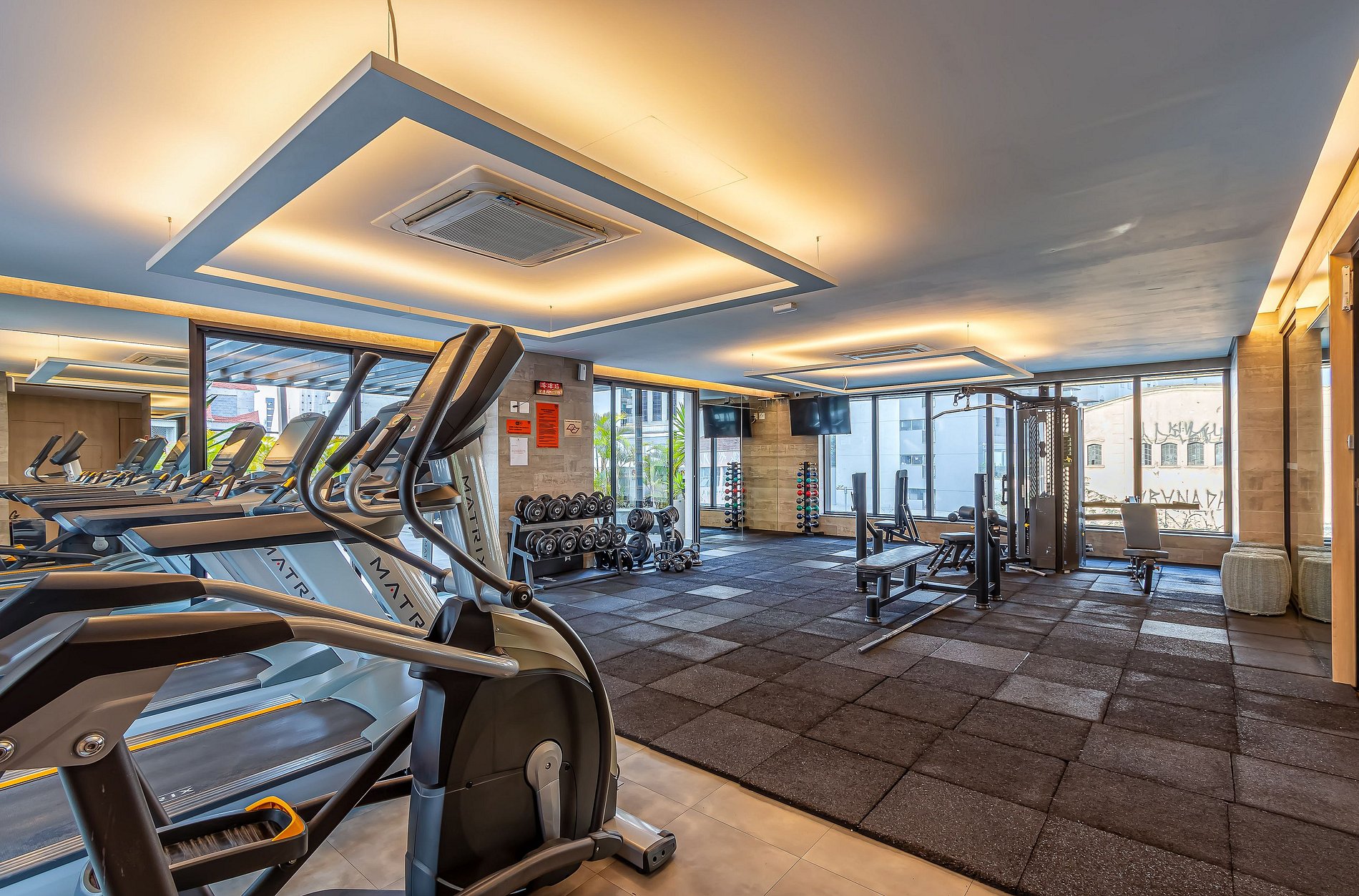 - Academia (6h às 12h e das 13h às 24h, 3. andar, acesso externo equipada com esteiras, bicicletas ergométricas, aparelho multi-exercício e halteres)