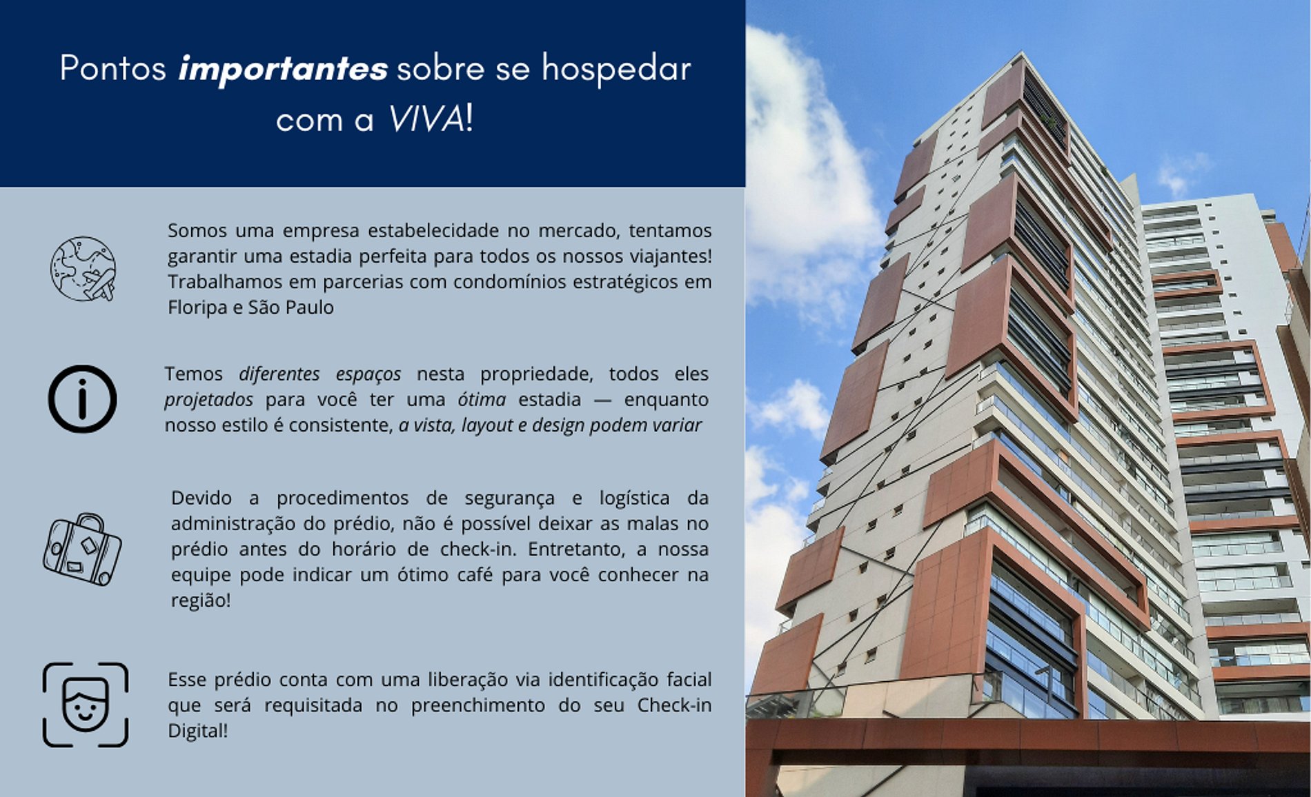 - Devido a procedimentos internos de segurança e logística da administração do prédio, não é possível deixar as malas no prédio antes do horário de check-in.