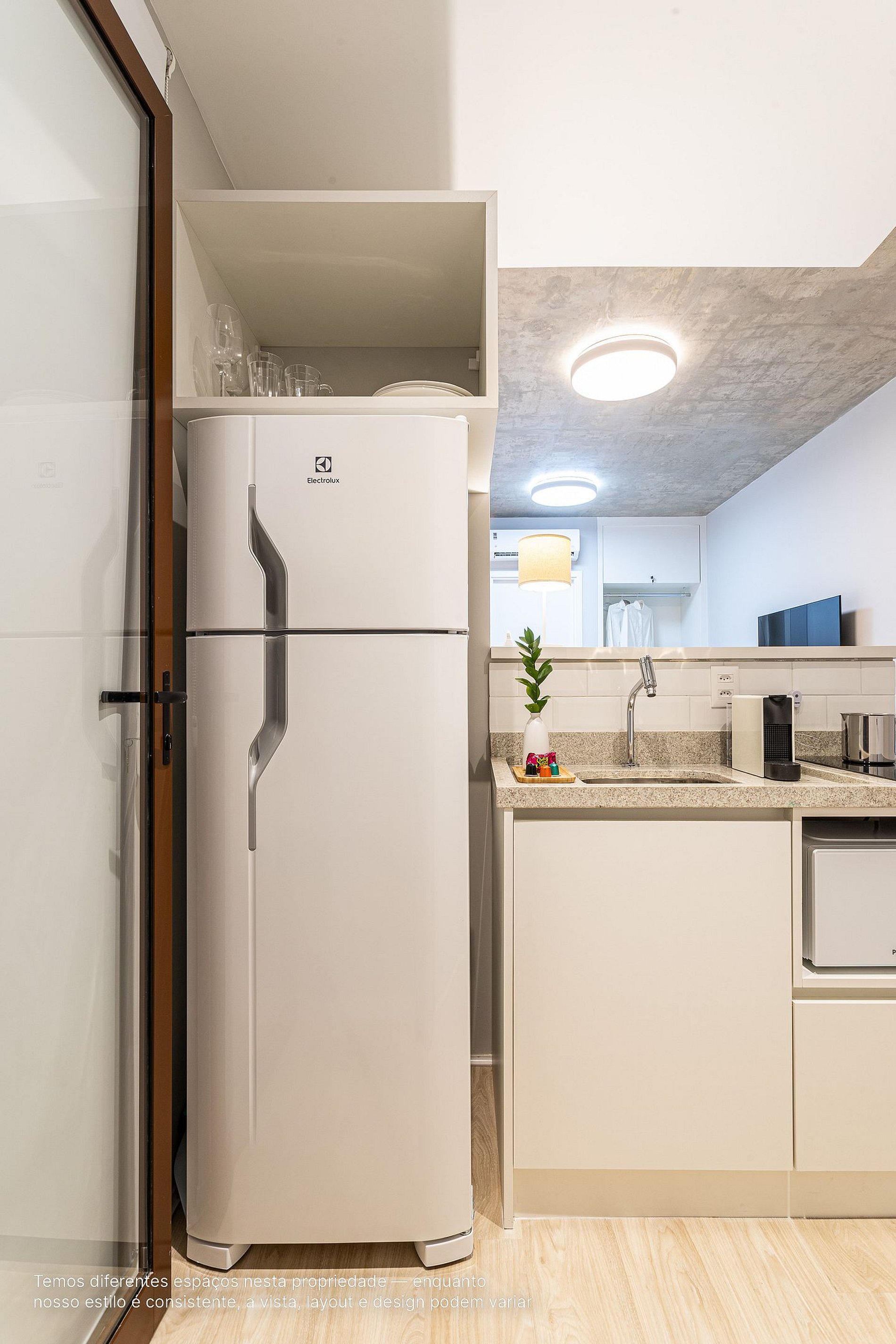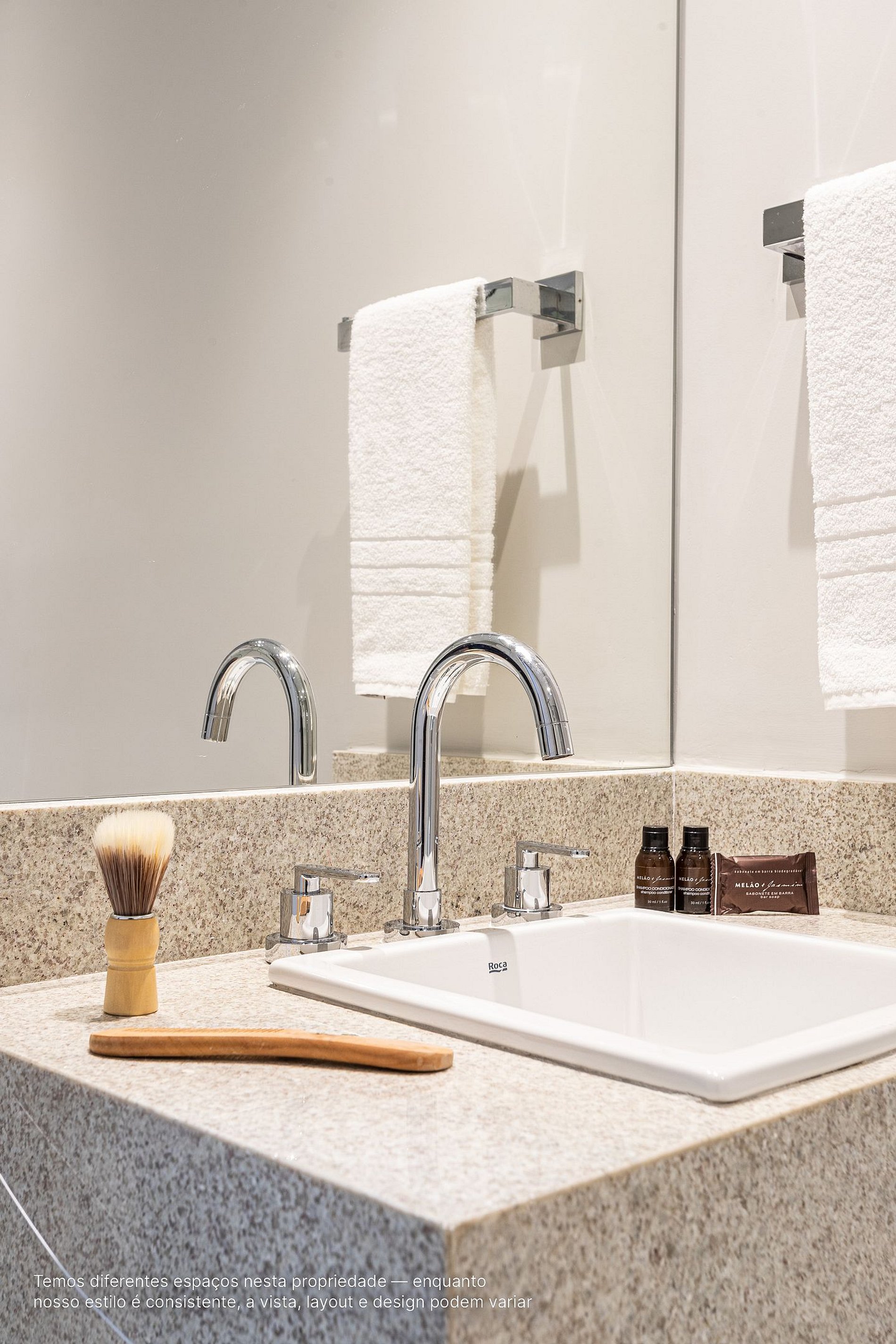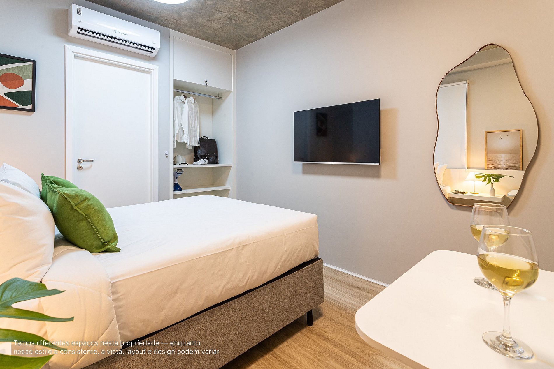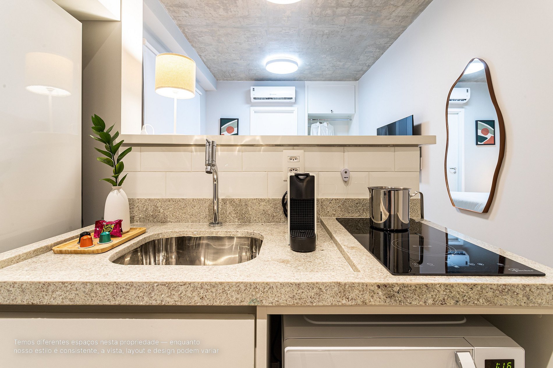 - A decoração e as amenidades dos apartamentos podem ter variações como cafeteira (pó x cápsula), ferro de passar x steamer, fogão x cooktop (com ou sem forno).