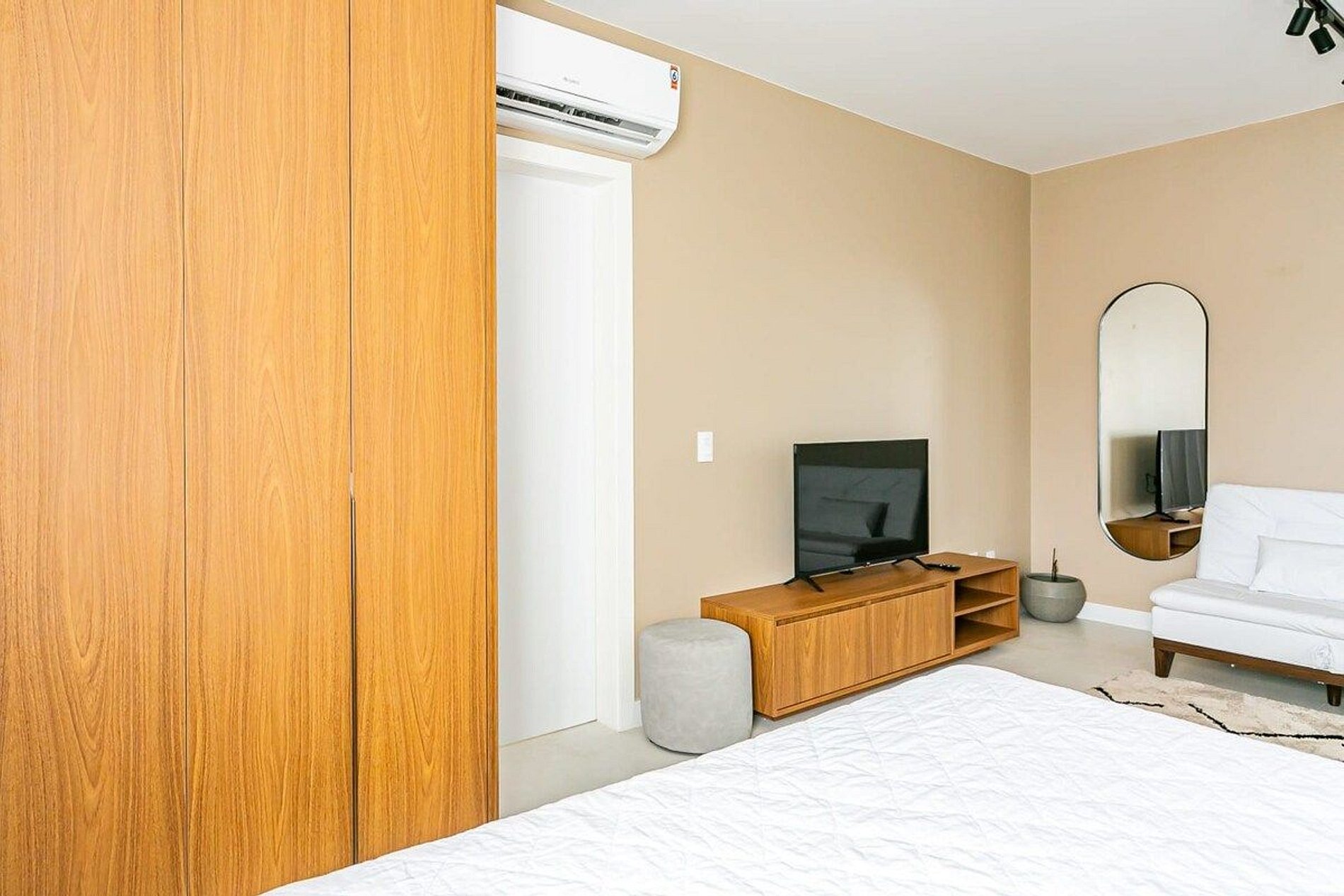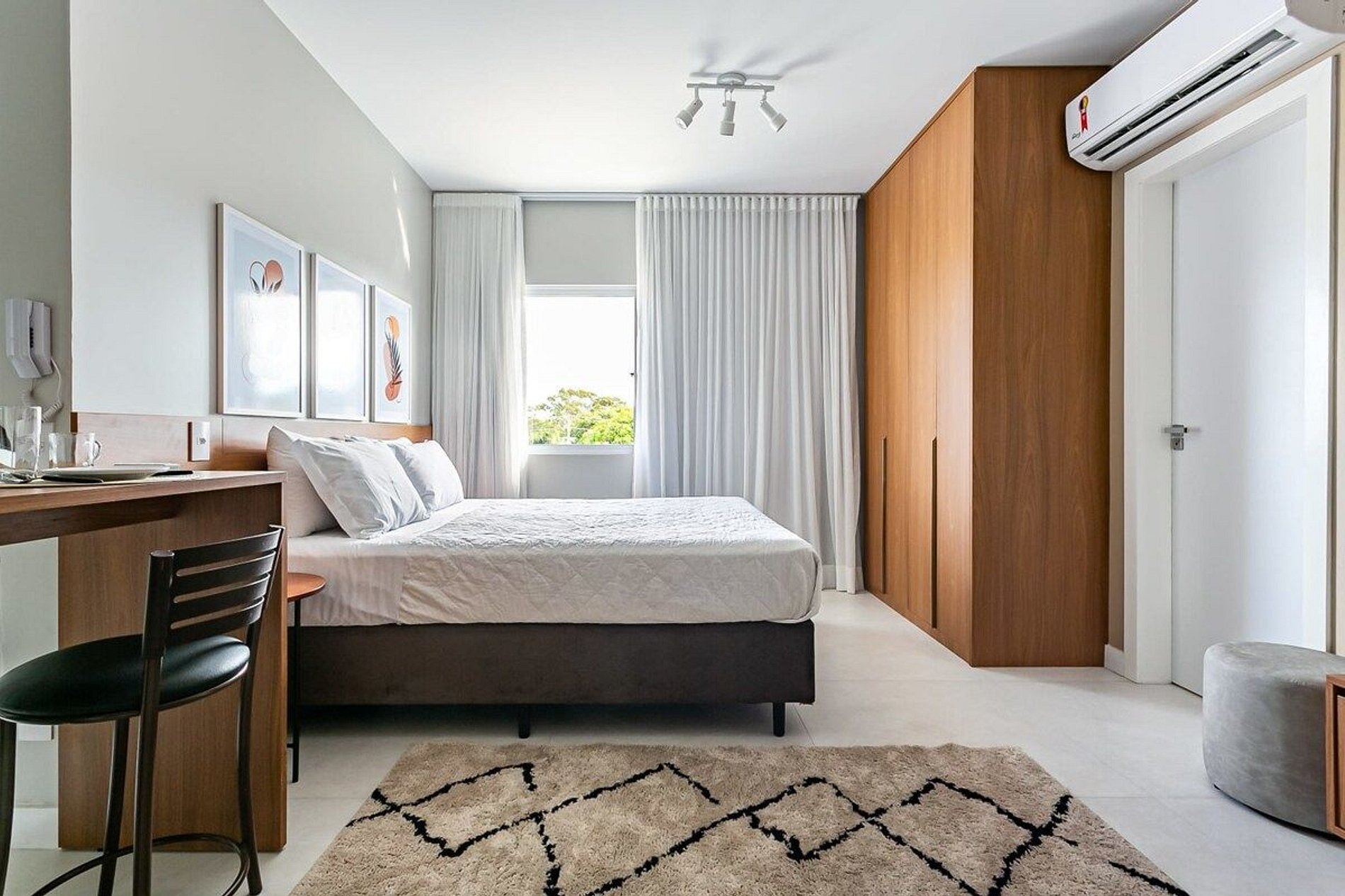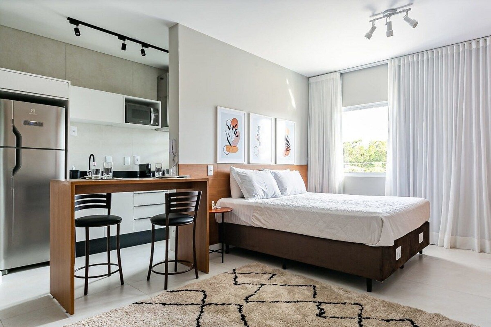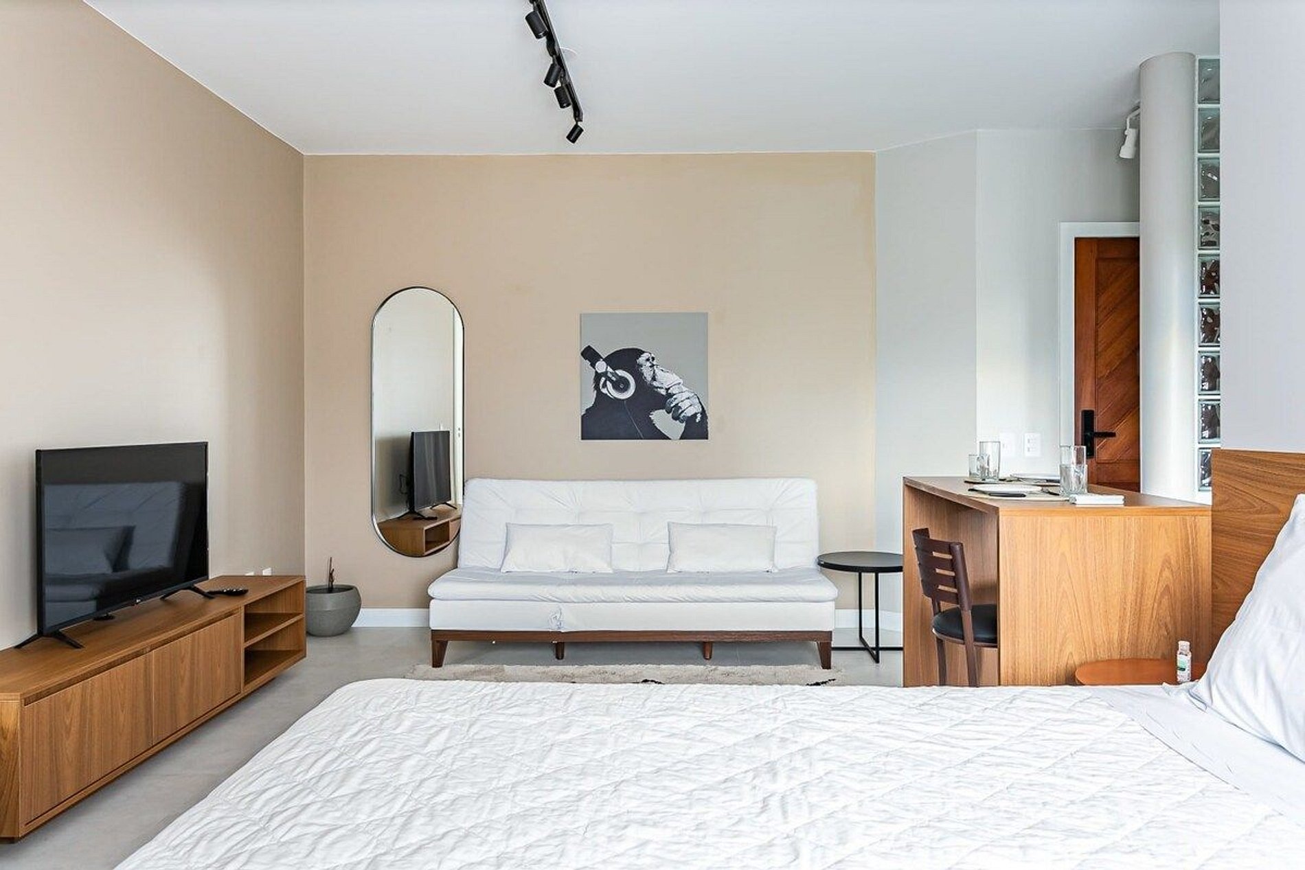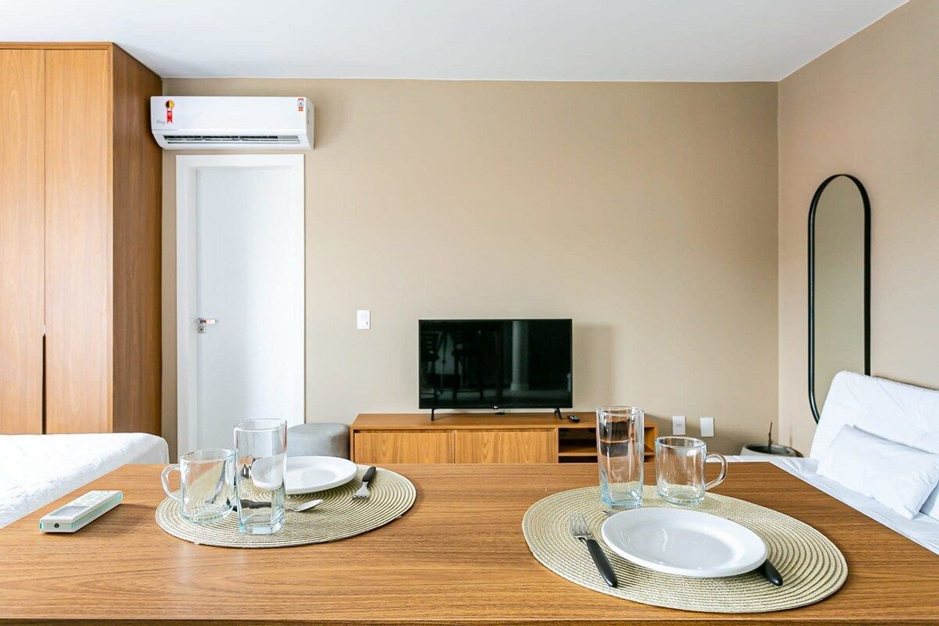 O estúdio é funcional e conta com cozinha completa, ar-condicionado e churrasqueira. O prédio é moderno e possui piscina, academia, lavanderia e churrasqueira no terraço que você poderá desfrutar durante sua estadia.