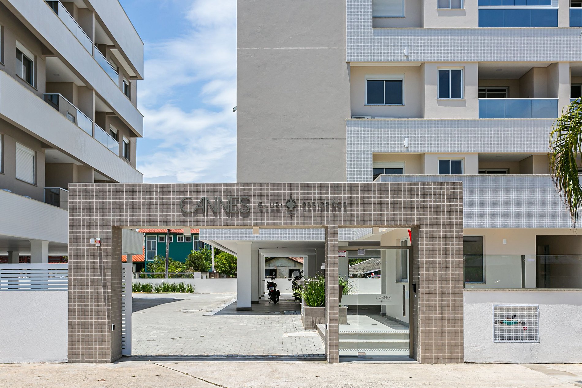 • O prédio se chama “Cannes Club Residente” e possui uma fachada Branca e Bege.