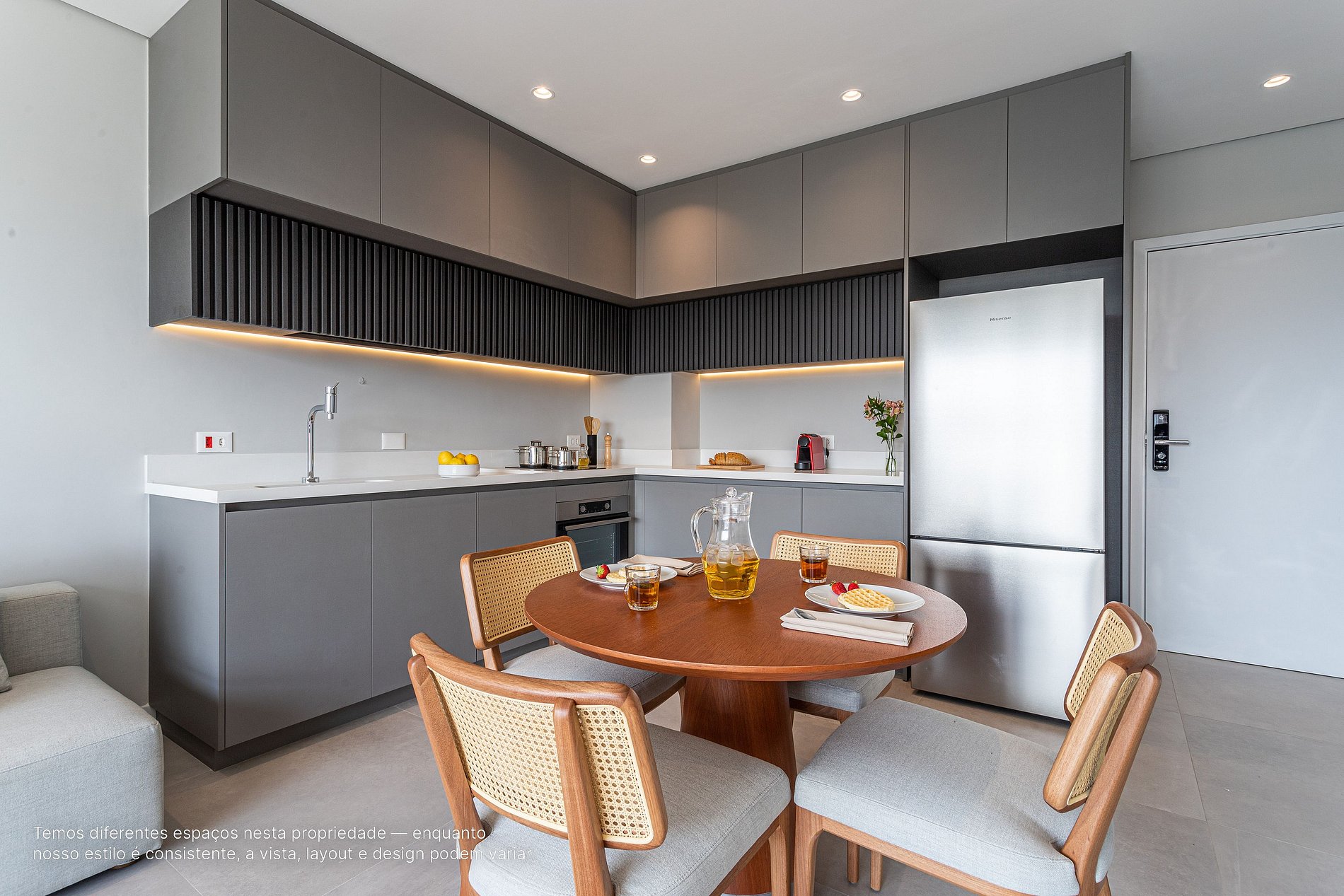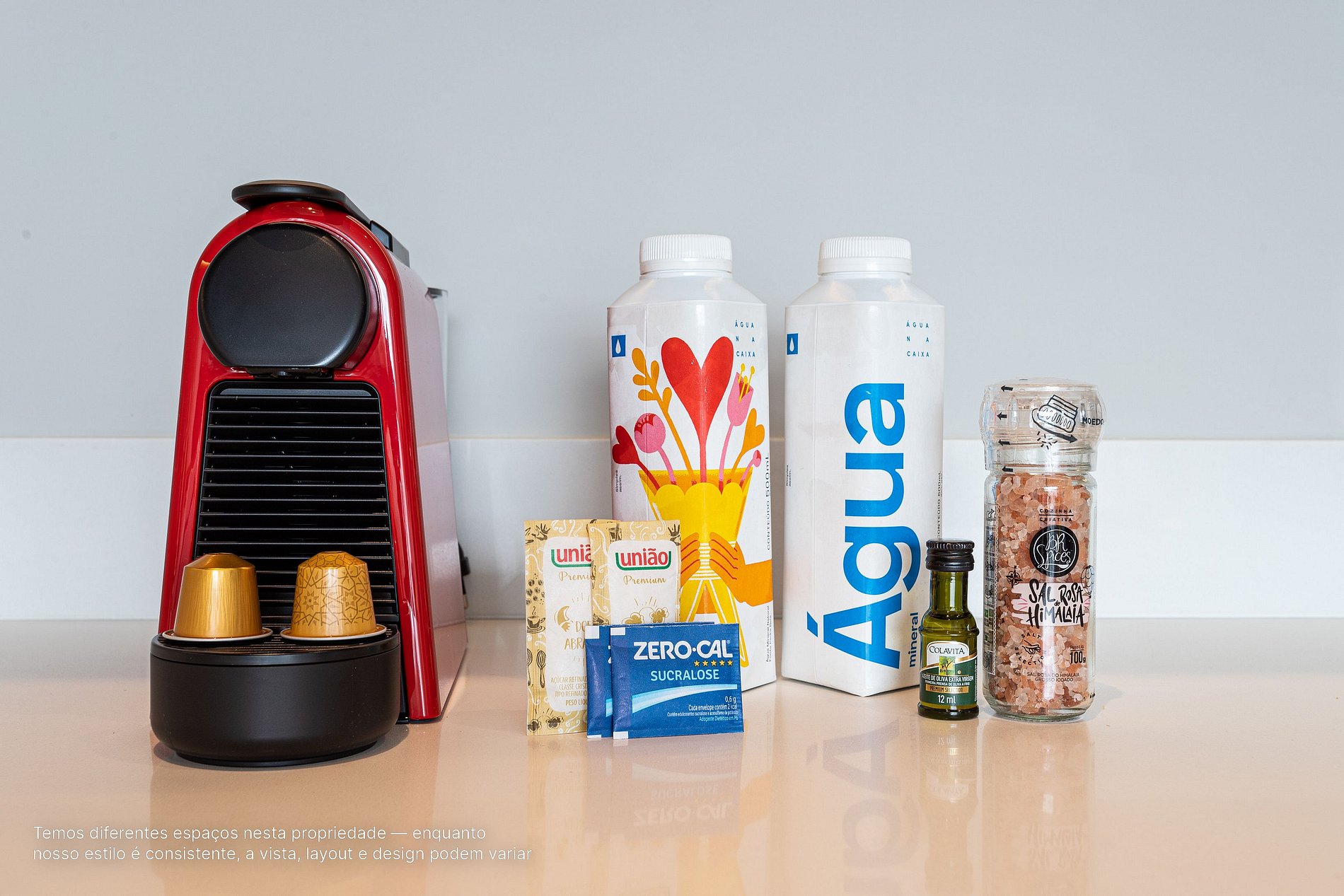 - A decoração e as amenidades dos apartamentos podem ter variações como cafeteira (pó ou cápsula), ferro de passar x steamer, fogão x cooktop (com ou sem forno).