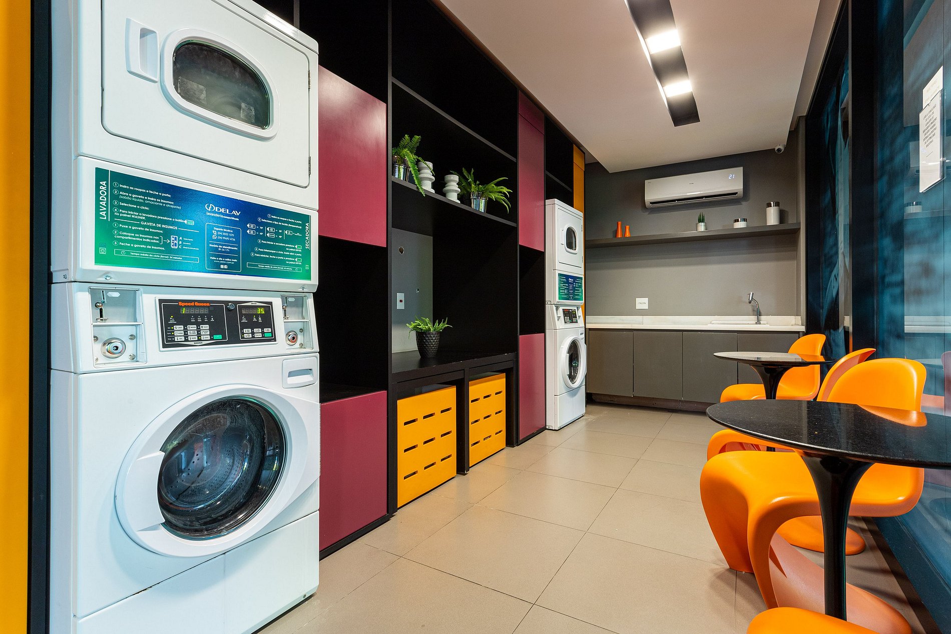 Lavanderia 24h (Andar térreo, serviço pago, produtos não inclusos, necessário levar sabão líquido, uso compartilhado mediante disponibilidade, pagamento via aplicativo)