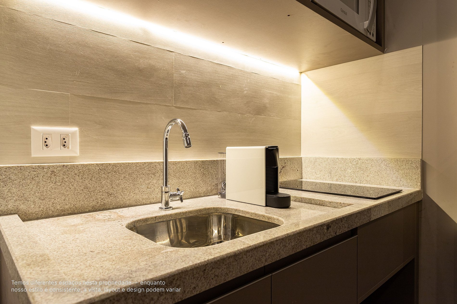 - A decoração e as amenidades dos apartamentos podem ter variações como cafeteira (pó x cápsula), ferro de passar x steamer, fogão x cooktop (com ou sem forno).