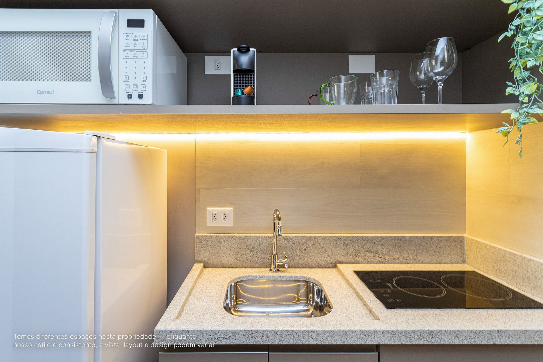 - A decoração e as amenidades dos apartamentos podem ter variações como cafeteira (pó x cápsula), ferro de passar x steamer, fogão x cooktop (com ou sem forno).