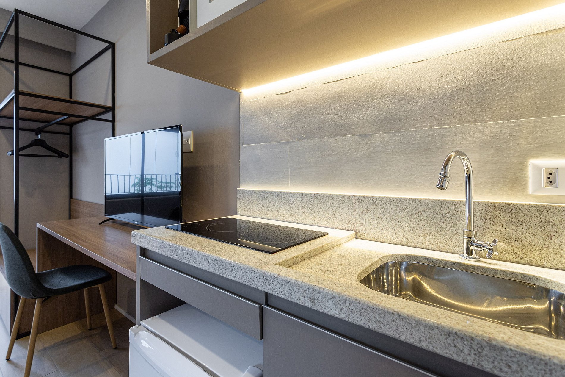 - Cozinha equipada com frigobar e itens básicos para o preparo de refeições rápidas