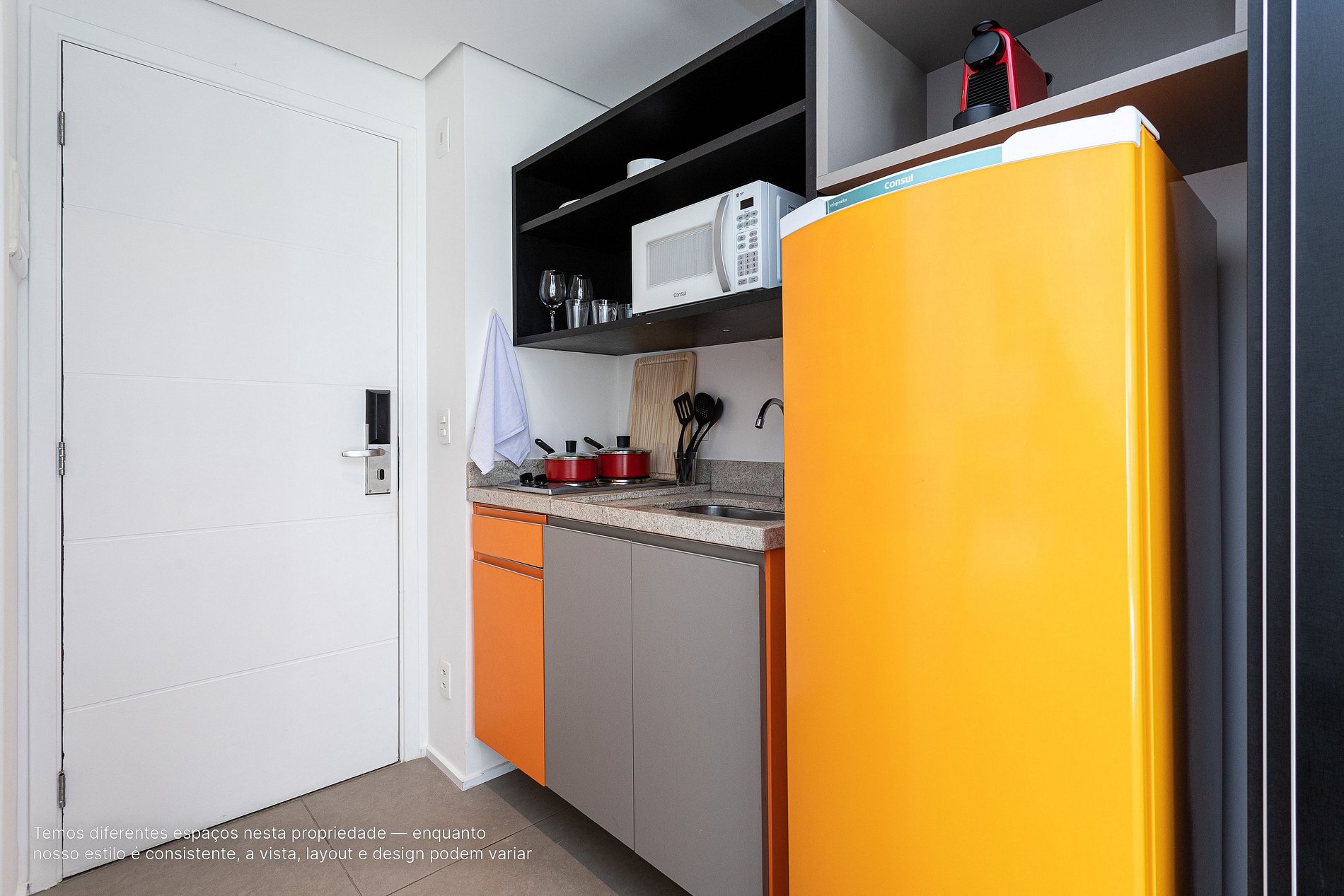 - A decoração e as amenidades dos apartamentos podem ter variações como cafeteira (pó x cápsula), ferro de passar x steamer, fogão x cooktop (com ou sem forno).