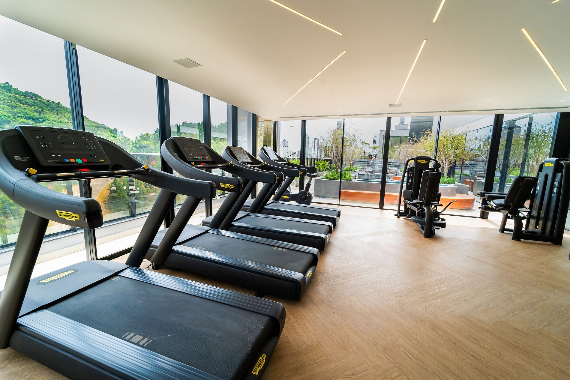Academia (Andar A - Rooftop, das 06 à 00h, equipada com esteira, bicicleta ergométrica, multi estação de musculação e banco regulável, uso mediante disponibilidade)