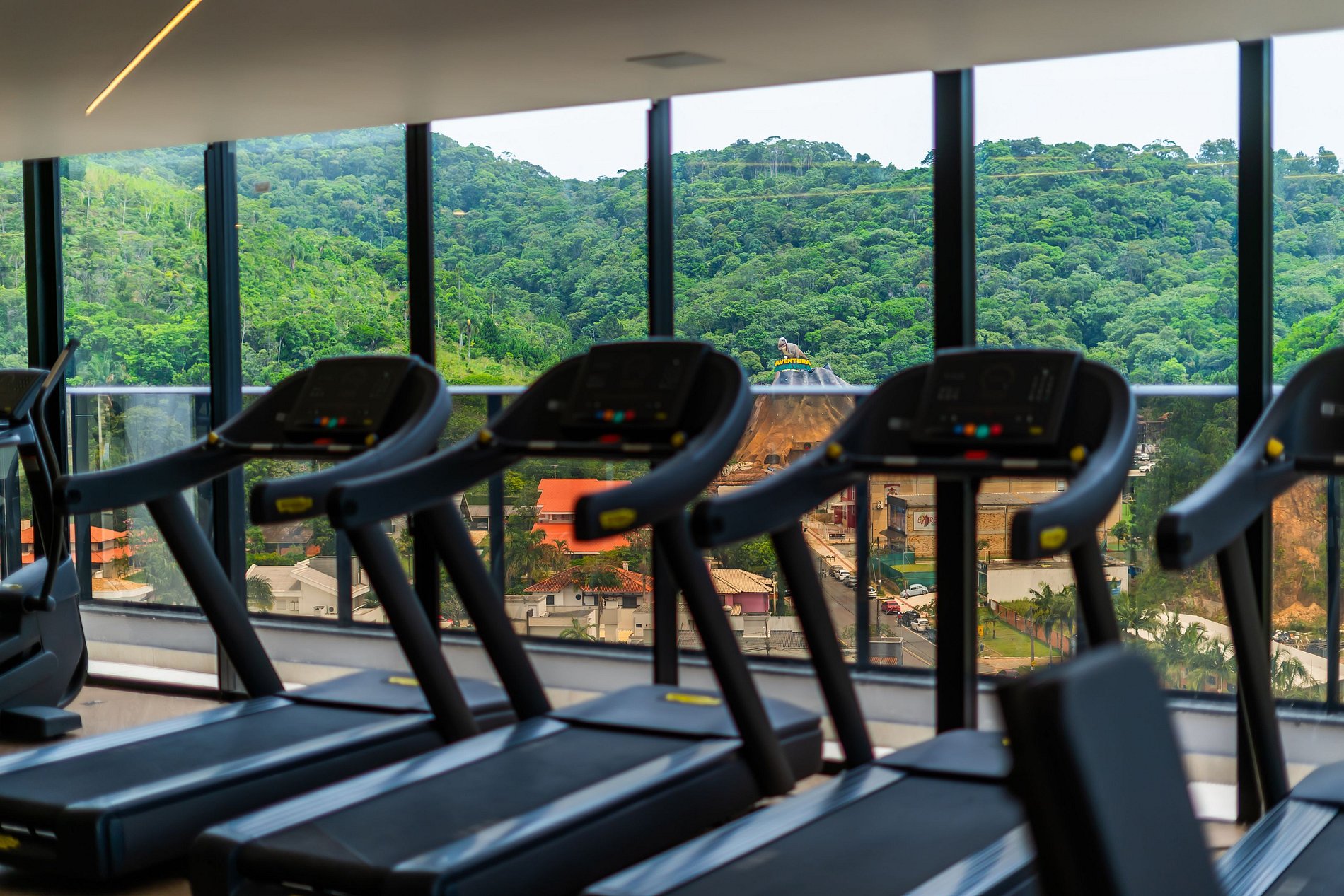 Academia (Andar A - Rooftop, das 06 à 00h, equipada com esteira, bicicleta ergométrica, multi estação de musculação e banco regulável, uso mediante disponibilidade)